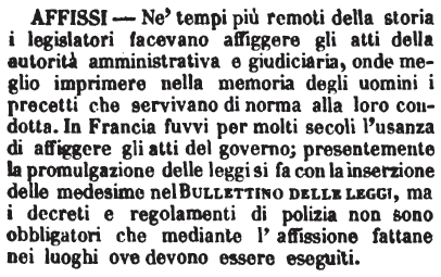 Affissi - Ne' tempi più remoti della storia i legislatori facevano affiggere gli atti della autorità amministrativa e giudiciaria, onde meglio imprimere nella memoria degli uomini i precetti che servivano di norma alla loro condotta. In Francia fuvvi per molti secoli l'usanza di affiggere gli atti del governo; presentemente la promulgazione delle leggi si fa con la inserzione delle medesime nel Bullettino delle leggi, ma i decreti e regolamenti di polizia non sono obbligatori che mediante l'affissione fattane nei luoghi ove devono essere eseguiti. [immagine]