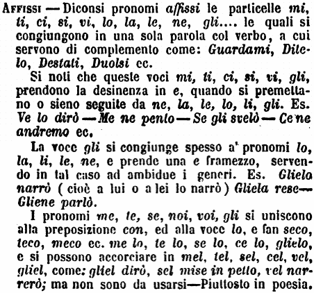 Si noti che queste voci mi, ti, ci, si, vi, gli, prendono la desinenza in e, quando si premettano o sieno seguite da ne, la, le, lo, li, gli. Es. Ve lo dirò - Me ne pento - Se gli svelò - Ce ne andremo ec.