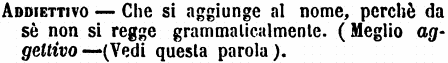 | Aggettivo - Lo stesso che addiettivo, o aggiuntivo, che deriva dal latino adjectivus, è parola che si unisce a' nomi per indicare più distintamente le persone o le cose di cui si parla.