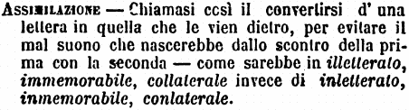 | Assimilazione - Chiamasi così il convertirsi d'una lettera in quella che le vien dietro, per evitare il mal suono che nascerebbe dallo scontro della prima con la seconda - come sarebbe in illetterato, immemorabile, collaterale invece di inletterato, inmemorabile, conlaterale. [immagine] |