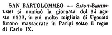 | San Bartolommeo - Saint-Barthilemi - Si nominò la giornata del 24 agosto 1572, in cui molte migliaia di Ugonotti furono massacrate in Parigi sotto il regno di Carlo IX. [immagine] |