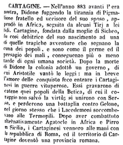 Cartagine - Nell'anno 883 avanti l'era nostra, Didone fuggendo la tirannia di Pigmalione fratello ed uccisore del suo sposo, approdò in Africa, seguita da alcuni Tirj a lei fidi. Cartagine, fondata dalla moglie di Sicheo, fu così debitrice del suo nascimento ad una di quelle tragiche avventure che segnano la cuna dei popoli, e sono come il germe ed il presagio dei mali, conseguenze più o meno tarde di ogni umana società. Dopo la morte di Didone la colonia adottò un governo, di cui Aristotile vantò le leggi: ma in breve l'amore delle conquiste fece entrare i Cartaginesi in guerre vituperose. Essi gravarono di catene quei popoli della Betica, di cui il coraggio non salvò la virtù; si unirono con Serse, e perderono una battaglia contro Gelone, nel giorno stesso che i Lacedemoni soccombevano alle Termopili. Dopo aver combattuto alternativamente Agatocle in Africa e Pirro in Sicilia, i Cartaginesi vennero alle mani con la repubblica di Roma, ed il territorio di Cartagine doventò una provincia romana. [immagine]