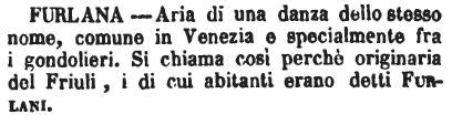 | Furlana - Aria di una danza dello stesso nome, comune in Venezia e specialmente fra i gondolieri. Si chiama così perchè originaria del Friuli, i di cui abitanti erano detti Furlani. [immagine] |
