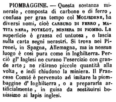 | Piombaggine - Questa sostanza minerale, composta di carbone e di ferro, confusa per gran tempo col Molibdene, ha diversi nomi, cioè carburo di ferro, matita nera, potelot, miniera di piombo. La superficie è grassa ed untuosa, e lascia sulla carta segni nerastri. Si trova nei Pirenei, in Spagna, Allemagna, ma in nessun luogo è così pura come in Inghilterra. Perciò gl'Inglesi ne curano l'esercizio con grande arte; ne ritirano piccole quantità alla volta, e indi chiudono la miniera. Il Francese Comté è pervenuto ad imitare la piombaggine d'Inghilterra, o a prepararla artificialmente, in guisa da sostituirsi benissimo ai lapis inglesi. [immagine] |